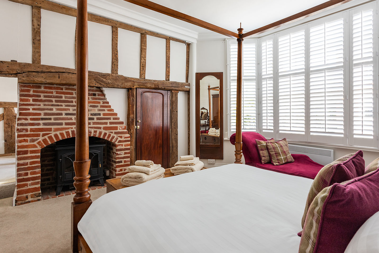 Master bedroom with a king size four poster bed, chaise lounge, dressing table and chair.