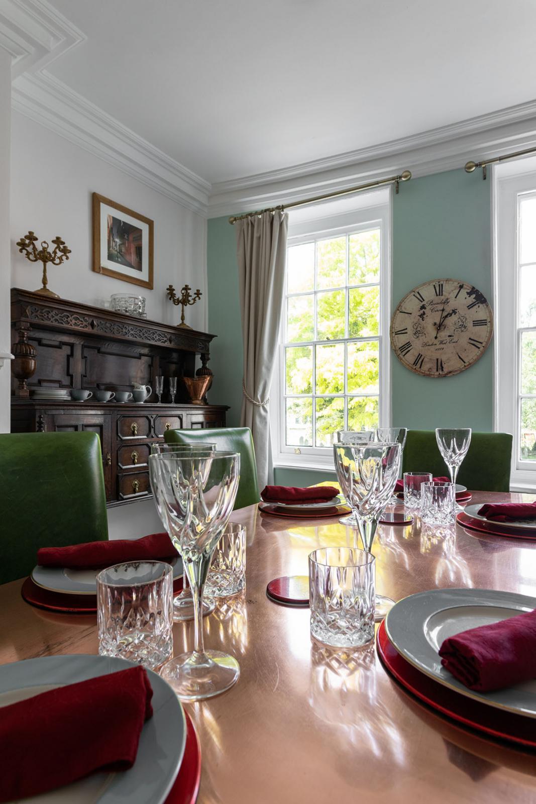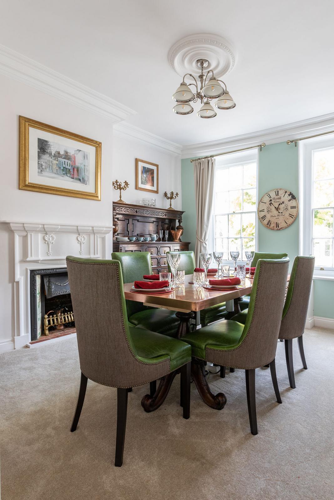 Dining room with a copper topped table and chairs seating six