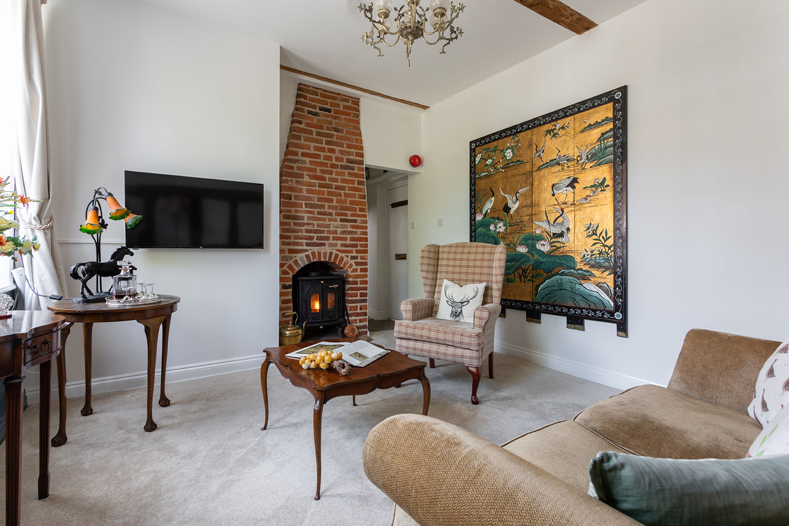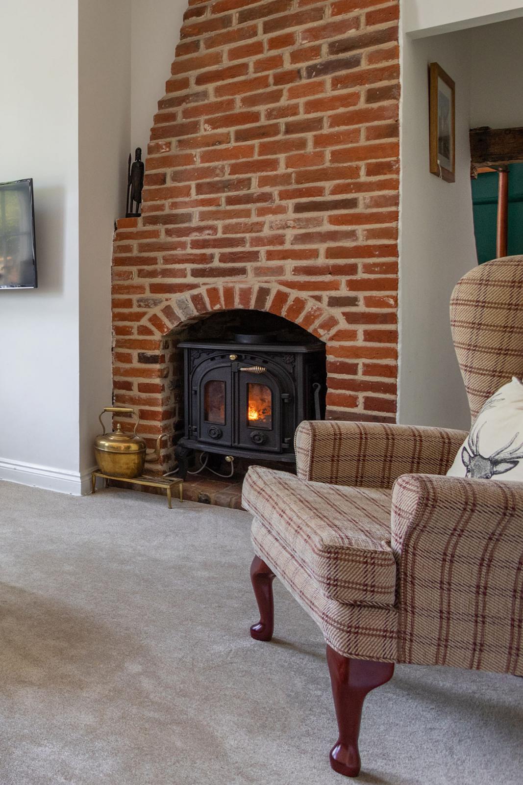 Sitting room with a comfy 2-seater sofa, armchair, and television.